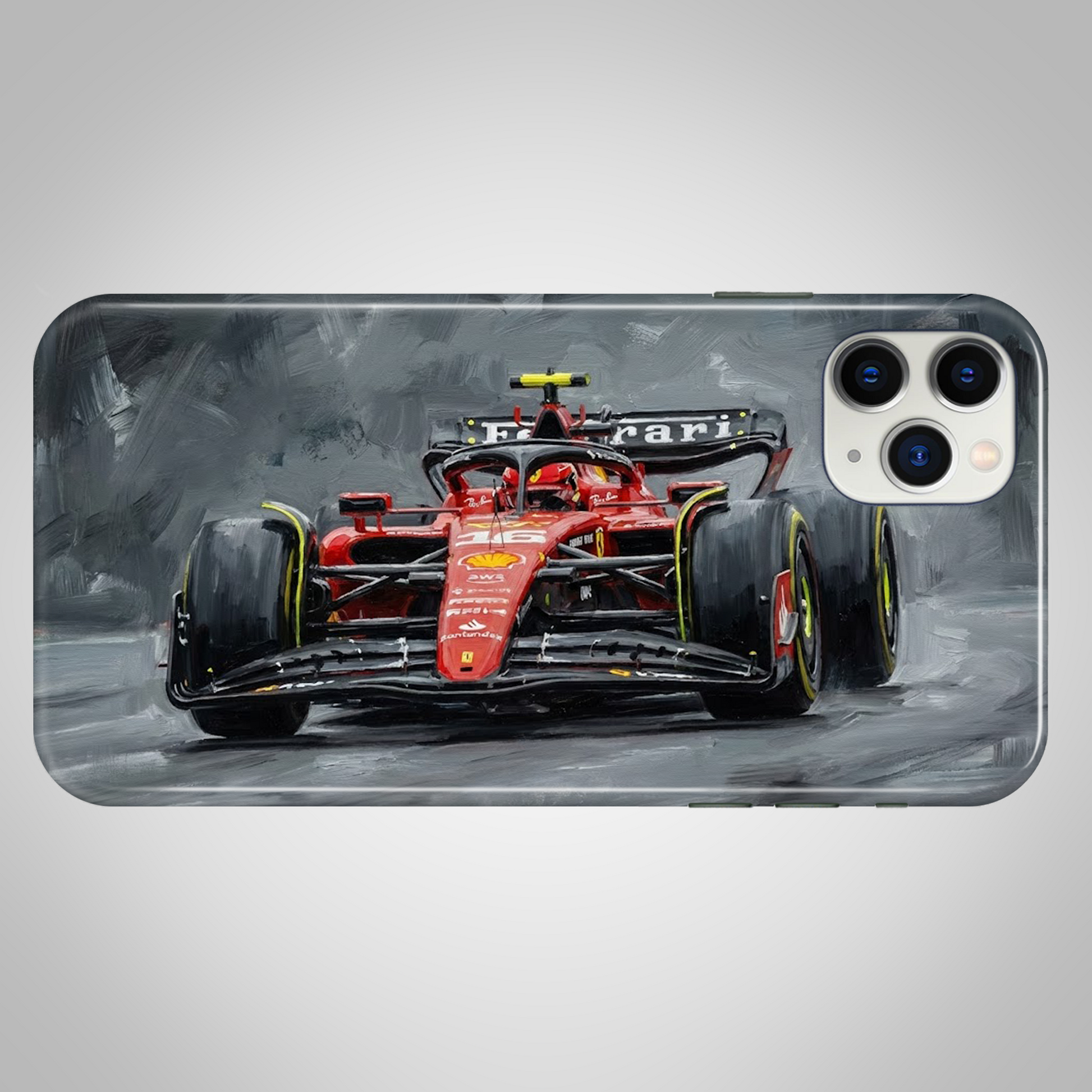 This phone case depicts the Formula 1 driver Charles Leclerc in his Ferrari Formula 1 car.